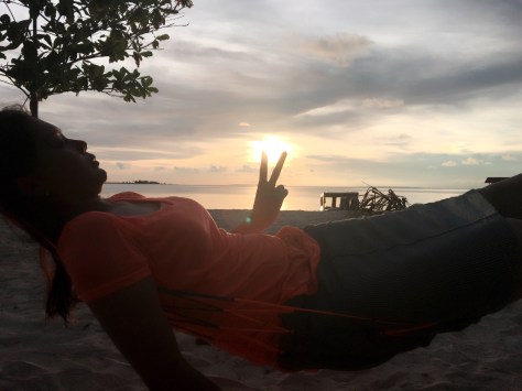 Apa lagi? Pemandangan sunset dan sunrise nya yang luar biasa, perpaduan warna sunset yang sangat indah kuning, orange, jingga, berparas cantik di langit biru dan berawan putih dipadu dengan warna biru laut yang jernih dan pasir putih yang bertebaran manis di pulau ini. Pemandangan ini kita lihat selama 4 hari disana, sambil main kano, atau sekedar main dipinggir pantai dengan berfoto-foto, atau menikmati sunset dengan tiduran di hammock. Nah, kalau saya menikmati sunset dengan makan mie rebus sekali makan 2 porsi lalu dilanjutkan dengan tiduran di hammock dan ini saya lakukan selama 4 hari berturut-turut, uppps. Hmmm, jujur sih saya susah bergaul, apalagi sama orang baru pasti banyak diemnya hehehe, dan butuh waktu lama untuk bisa akrab dengan yang lain.