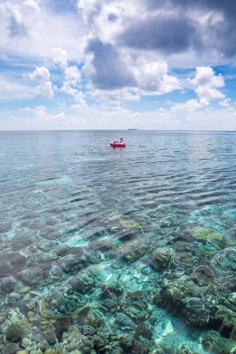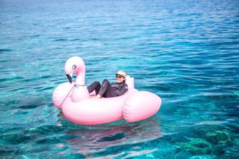 dan tentunya keberuntungan ini ditambah dengan teman-teman trip yang sangat mengasikkan, semuanya unik dan punya kelucuan masing-masing. Kami sampai punya maskot tersendiri bernama Tamara, dy adalah burung flaminggo pink yang sangat besar dan siap membawa kita menikmati laut sambil berjemur atau sekedar tempat untuk melepas lelah dari snorkling dan diving.
